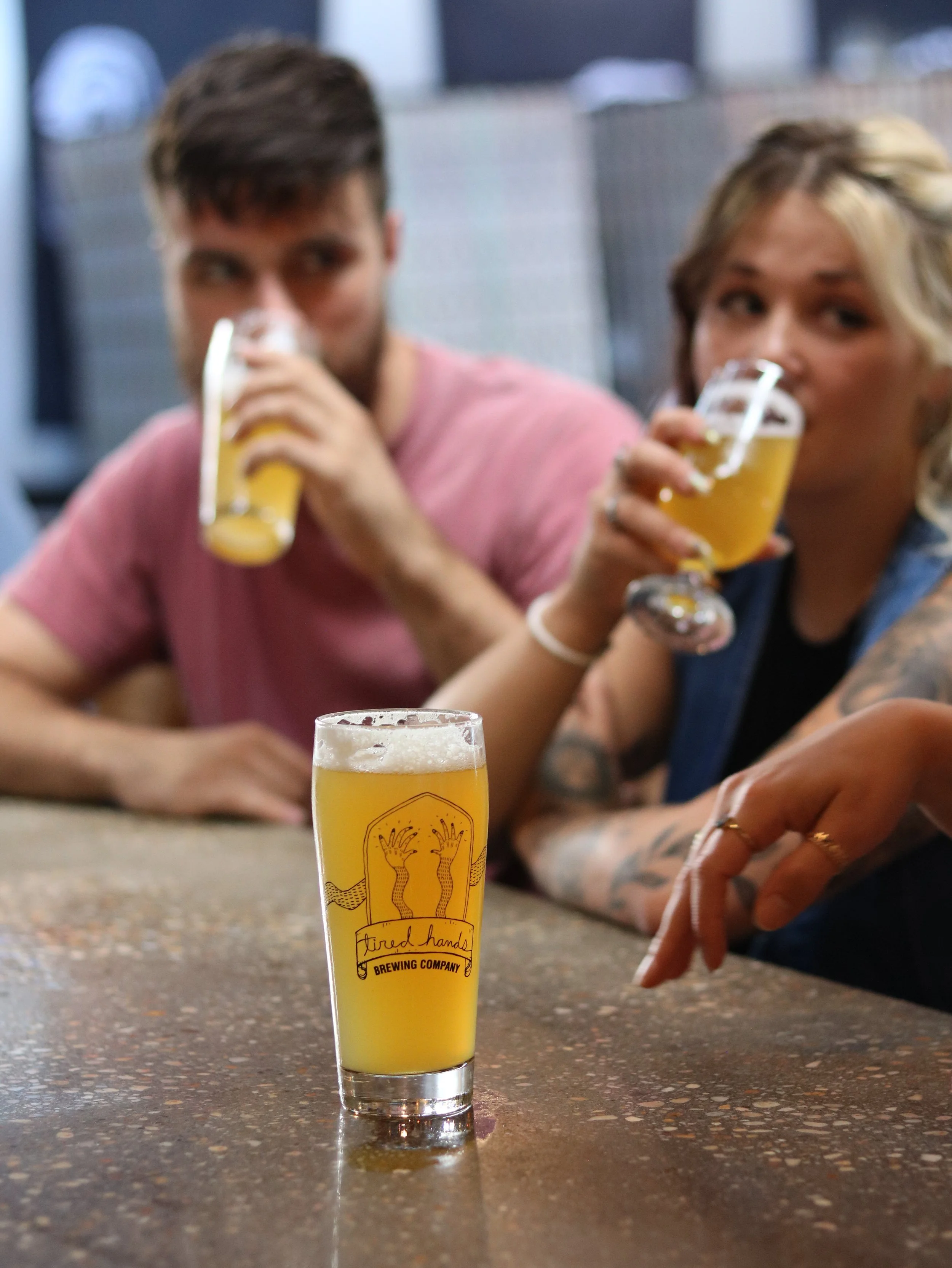 A woman smiling while sitting at a bar with a glass of beer in front of her. The beer glass has a logo that says 'Fired Hands Brewing Company.' Other people are blurred in the background.